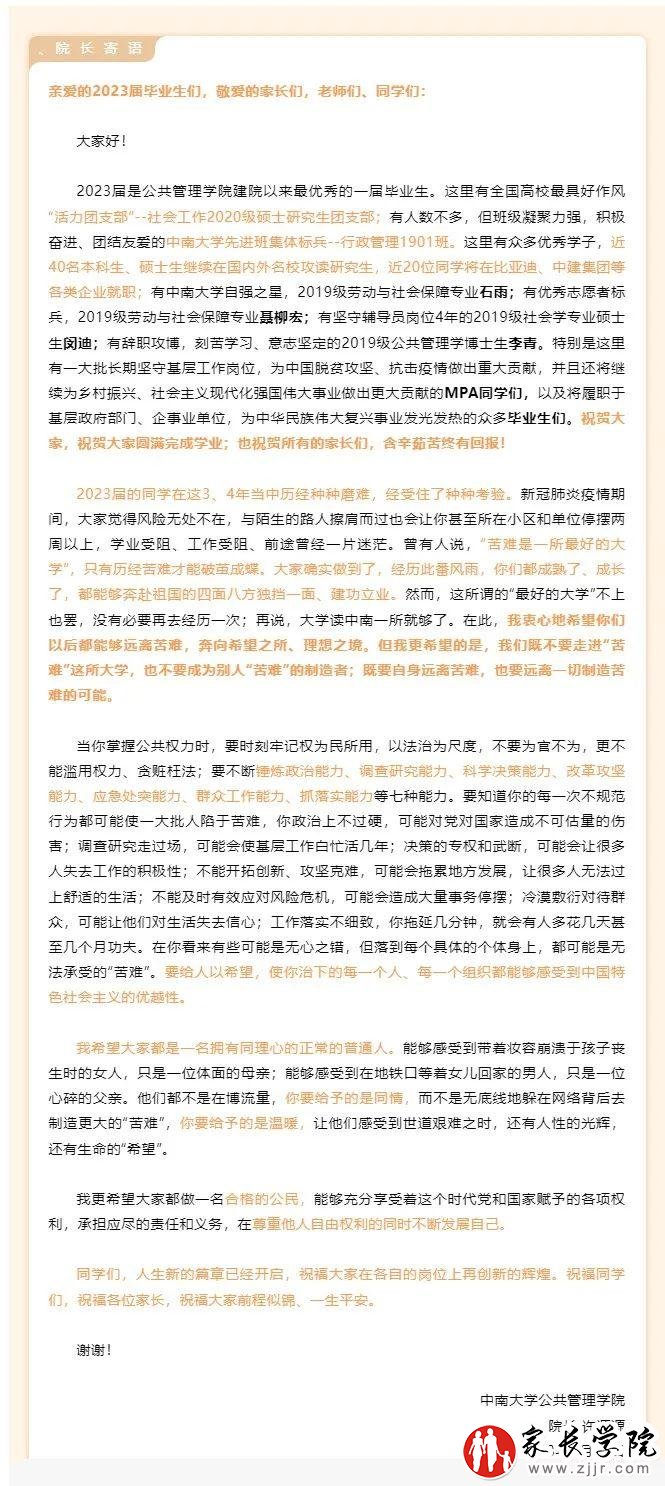 6月16日晚,中南大学公共管理学院公布了院长许源源在2023年毕业典礼暨学位授予仪式上的讲话全文。